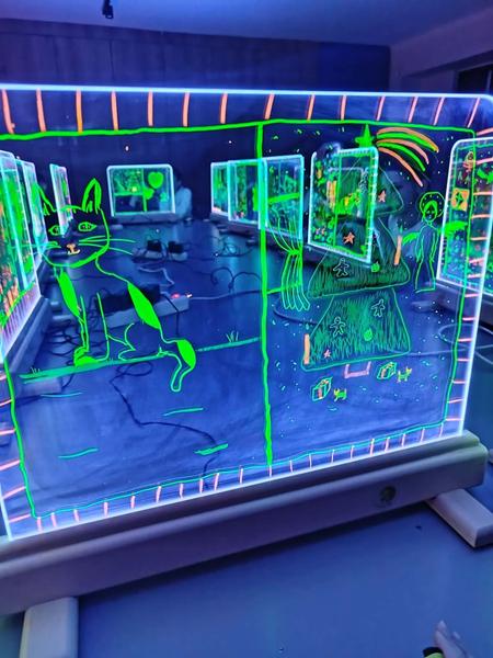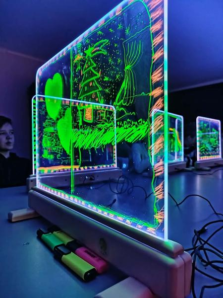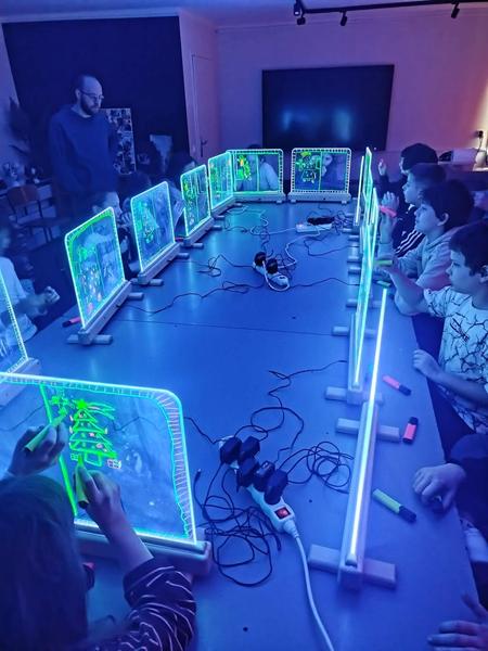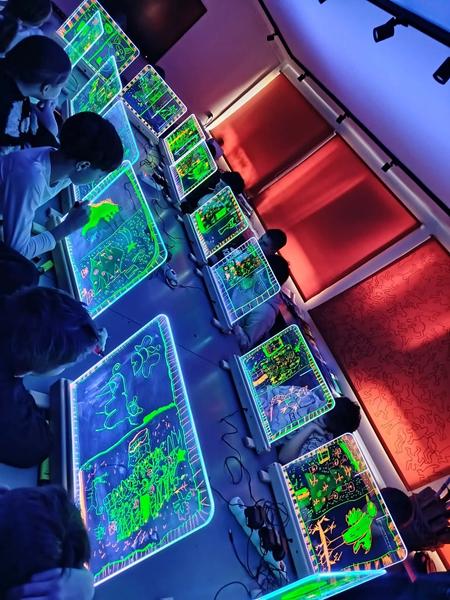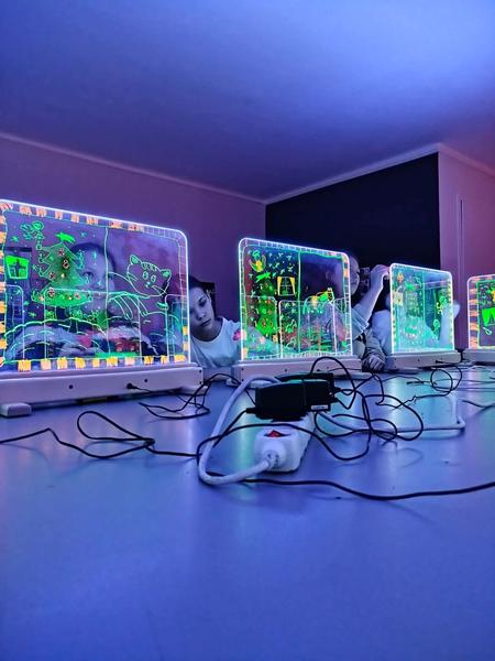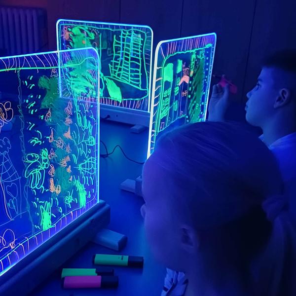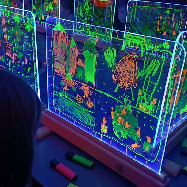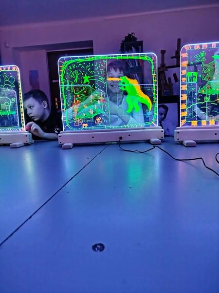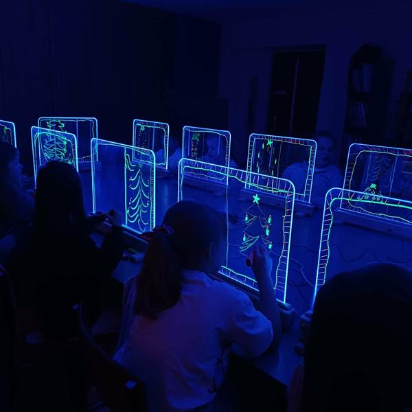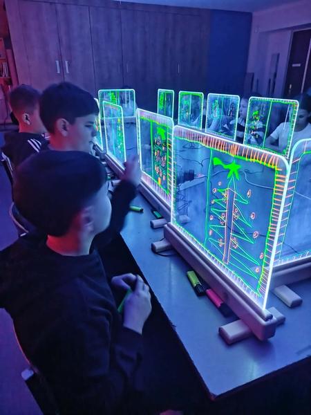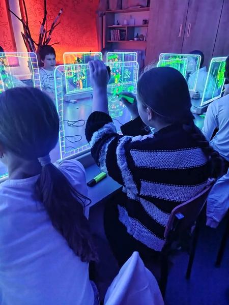 Te wyjątkowe zajęcia dostarczyły dzieciom i młodzieży wiele radości i twórczej swobody. Praca na szklanych, podświetlanych sztalugach oraz misach LED pobudzała wyobraźnię i zachęcała do eksperymentowania. Uczniowie mieli okazję rozwijać kreatywność, koncentrację, sprawność manualną oraz samoświadomość w przyjaznej, inspirującej atmosferze.